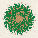 A red, green and white mandala surrounded by a green wreath